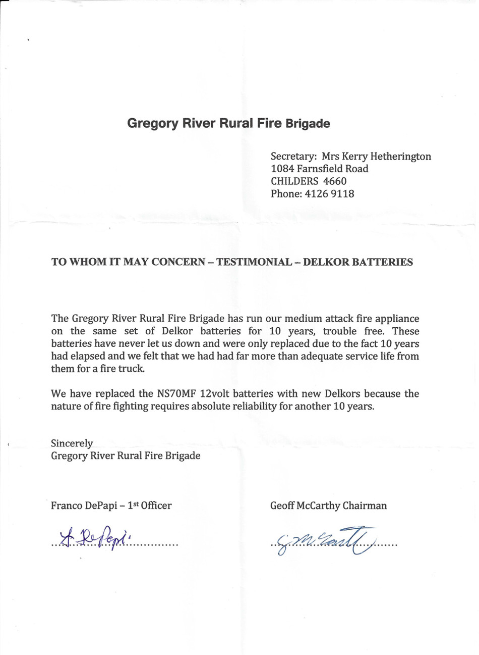 “The Gregory River Rural Fire Brigade has run our medium attack fire appliance on the same set of  Delkor  batteries  for  10  years,  trouble  free.  These batteries have never let us down and were only replaced due to the fact 10 years had elapsed and we felt that we had had far more than adequate service life from them for a fire truck.