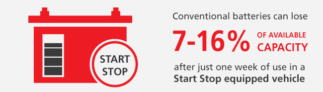 For Idle Start-Stop (ISS) vehicles, it’s important to fit the correct battery. Fitting a traditional battery will impair the Start/Stop function and noticeably reduce the battery’s life. Research shows that some conventional batteries can lose between 7% and 16% of capacity after just one week of use in a Start-Stop car.