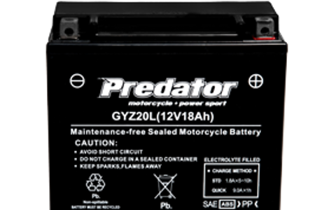 Our Predator Motorcycle and Power Sports range consists of two unique offerings: our AGM range providing a total maintenance-free operation and the Conventional range, exceeding many original OEM specifications for starting and AMP hour capabilities.