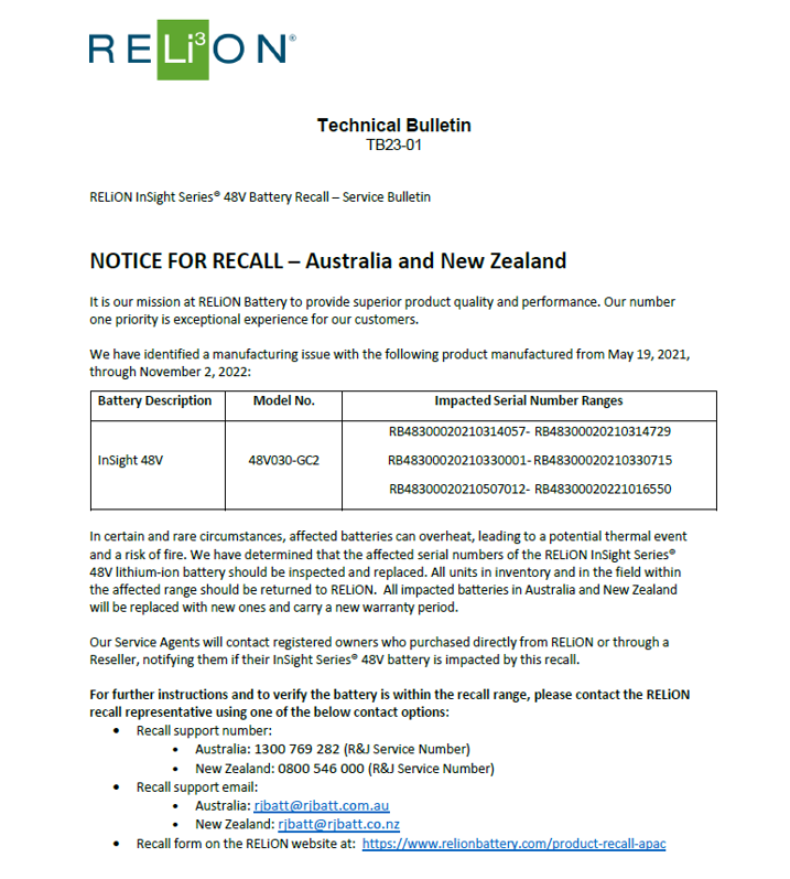 In certain and rare circumstances, affected batteries can overheat, leading to a potential thermal event and a risk of fire. We have determined that the affected serial numbers of the RELiON InSight Series® 48V lithium-ion battery should be inspected and replaced. All units in inventory and in the field within the affected range should be returned to RELiON. All impacted batteries in Australia and New Zealand will be replaced with new ones and carry a new warranty period.